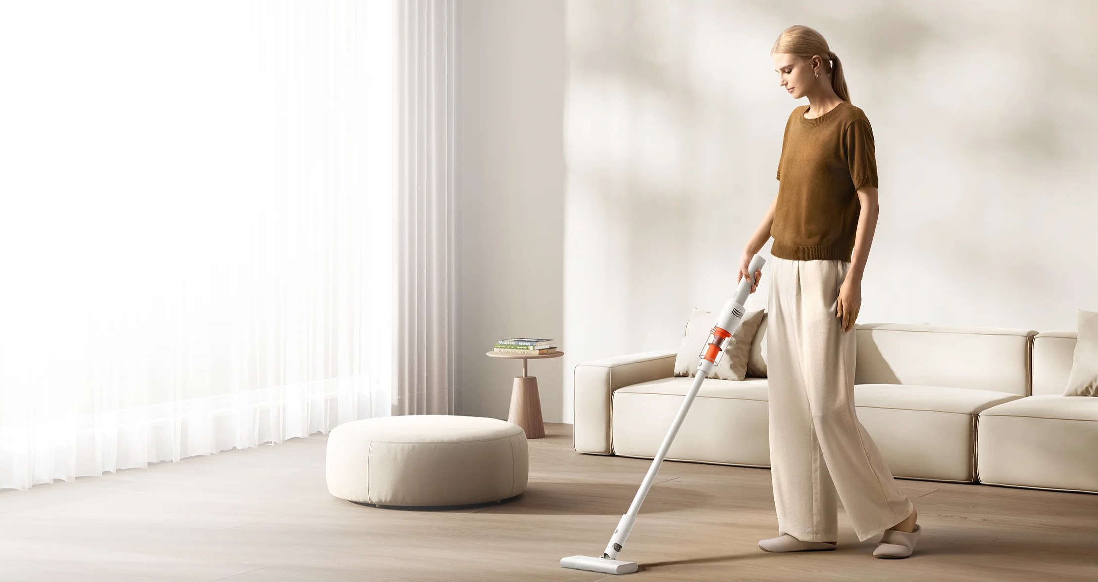 Вертикальный беспроводной пылесос Xiaomi Vacuum Cleaner P30 выполнен в компактном корпусе белого цвета с оранжевыми акцентами. Конструкция цельная, без разборной трубы, что делает устройство более устойчивым и удобным для быстрой уборки. Вес пылесоса составляет 1,46 кг, поэтому им комфортно пользоваться одной рукой и легко переносить между комнатами.